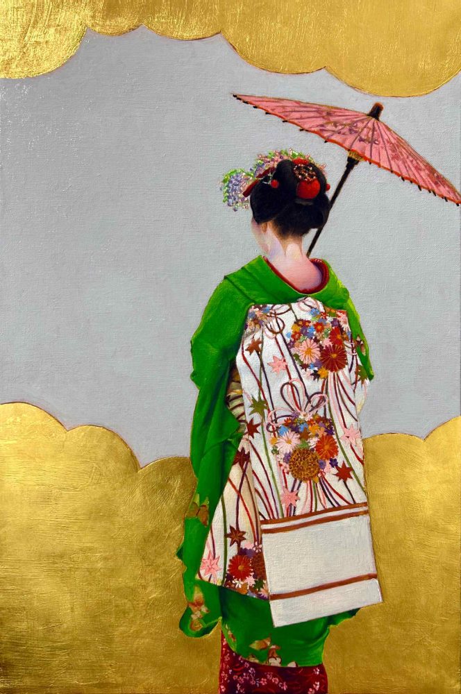 Il paesaggio cangiante viene, così, a coincidere con un’ecologia dello spazio pittorico. Percettivamente questa coincidenza si avverte scivolando dalla nuca del soggetto principale allo sfondo, isolando, poi, il dettaglio dell’arco della capigliatura raccolta in alto sul collo della fanciulla da tutto il resto, si può assaporare la sottile differenza tra due superfici. La Maiko, cioè la figura costante di questo ciclo, è perciò altro da un personaggio semplicemente ritratto, è il pretesto per le digressioni superficiali della pittura, digressioni che vanno dal virtuosismo decorativo alla variazione di toni e gradienti alternati, sino a stesure piatte e ai fondi oro.
