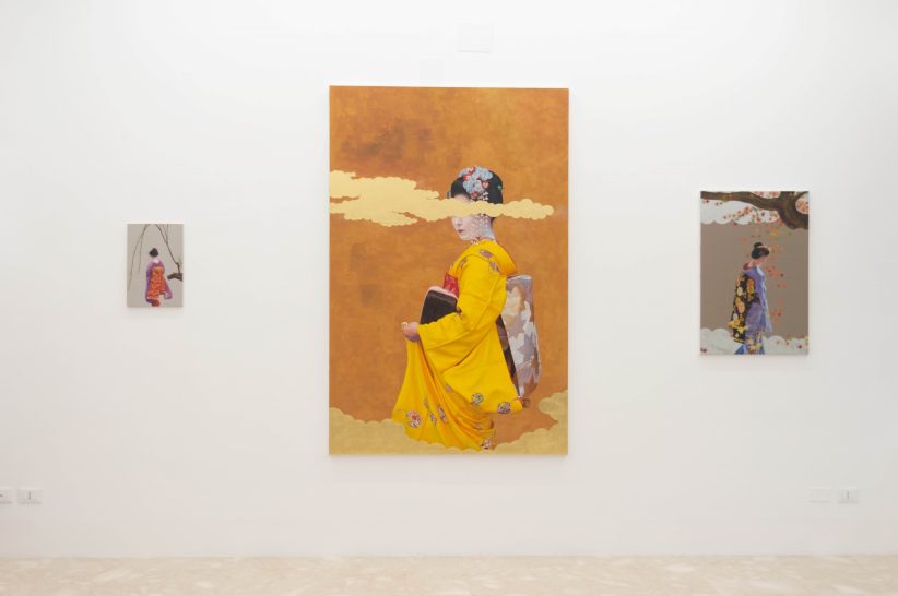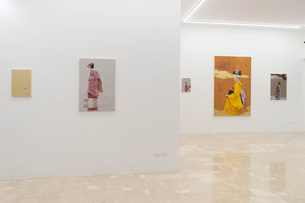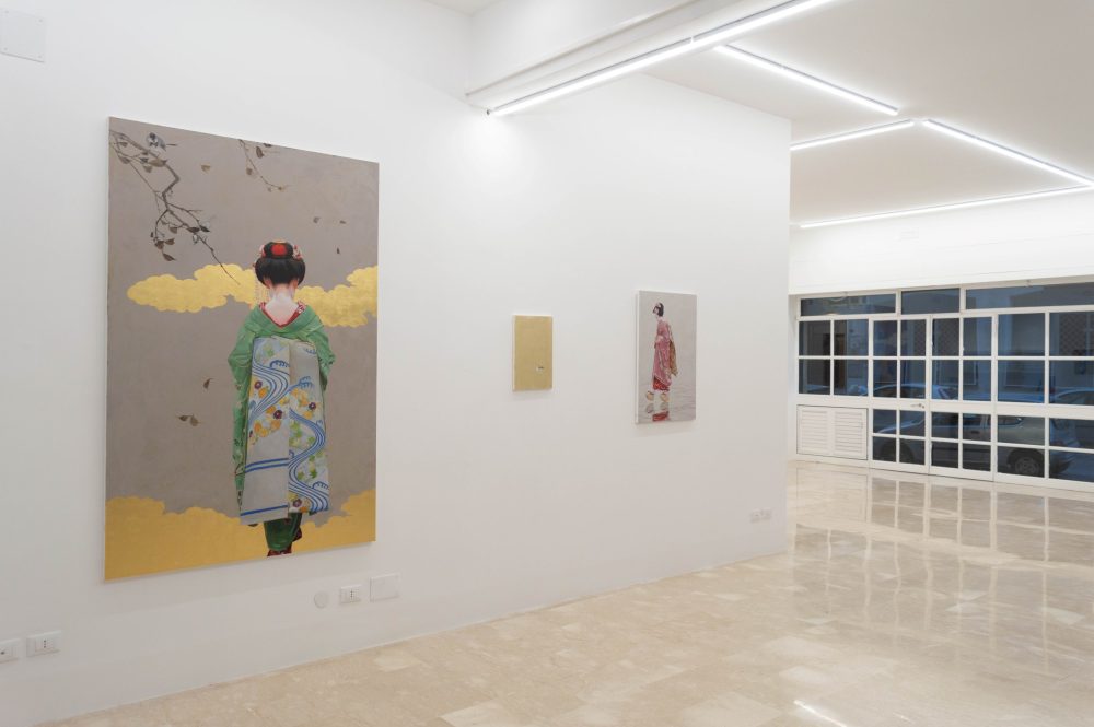 Nella sequenza del ciclo delle stagioni, ovvero nella messa in scena della Maiko, a volte sembra però avere una funzione di astrazione delle modalità pittoriche. De Nola, bloccando un elemento formale, riassume la pittura in una dimensione flessibile ma coerente. Desirèe Maida, nel testo che accompagna la mostra, paragona questo lessema pittorico alla “Ninfa” di Aby Warburg, cioè le attribuisce la funzione di una “Pathosformlen” che personifica il tempo. Eppure, specifica la curatrice, la maiko di Fabrice de Nola, presiedendo il tempo ci pilota fuori da esso in una sospensione capace di fermare la caducità della bellezza.