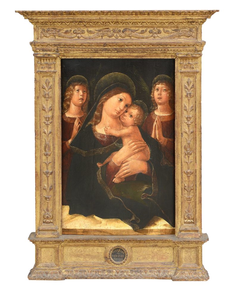 Si presenta dentro una cornice architettonica a tempietto in legno intagliato e dorato la Madonna con Bambino e angeli (base d’asta 90 mila euro) di Liberale da Verona. Le prime documentazioni lo vedono impegnato come miniatore, con commissioni a Siena, dove operò per il convento di Monteoliveto Maggiore e per il Duomo; forte il rapporto in questa fase iniziale di grande ispirazione col senese Sano di Pietro, prima dell’arrivo di Girolamo da Cremona, fondamentale nel ruolo di sviluppo dello svolgimento della materia pittorica e nello stimolo di un’accesa inventiva che porteranno Liberale ad esiti elevatissimi. Come quello presentato da Meeting Art.