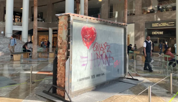 Nel frattempo, l’opera – protetta da una teca in plexiglass – si lascia intravedere nel Winter Garden di Brookfield Place, illuminata dai riflessi del sole. I passanti si fermano, curiosi. Alcuni scavalcano persino la corda per scattare una foto. E tra loro, c’è chi riconosce in quel cuore bendato un simbolo universale. Come Peggy, una donna che, con voce tremante, racconta che quel disegno le ricorda la propria lotta per sopravvivere. “Banksy non fa arte per dire stupidaggini. Sta cercando di raccontare qualcosa. E io lo capisco”.