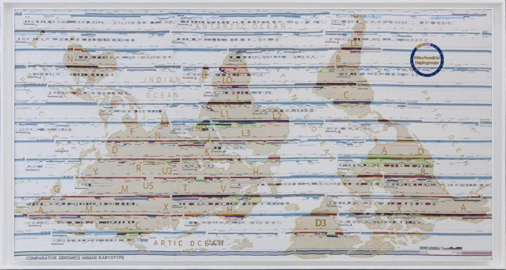 I planisferi di New Dheli sono costellati da lettere ricamate che segnano le mutazioni mitocondriali sopra i continenti, ad indicare una discendenza matrilineare ininterrotta e comune. La tessitura combina fili di cotone, juta, lino e lurex su tessuto di cotone, con una tecnica di ricamo classica. Genes Mundi, oggi si presenta come una cartografia della continuità storica nella sua reinvenzione contemporanea. Questo lavoro è il frutto della residenza dell’artista italiana su un progetto di contatto tra ottiche contemporanee e il ricamo a mano, un’iniziativa sostenuta da Maria Grazia Chiuri, direttore Creativo delle collezioni donna di Dior. La residenza è finalizzata promuovere il dialogo con artisti contemporanei nell’esplorazione dell’artigianato inteso alla stregua di un archivio vivente della storia umana.