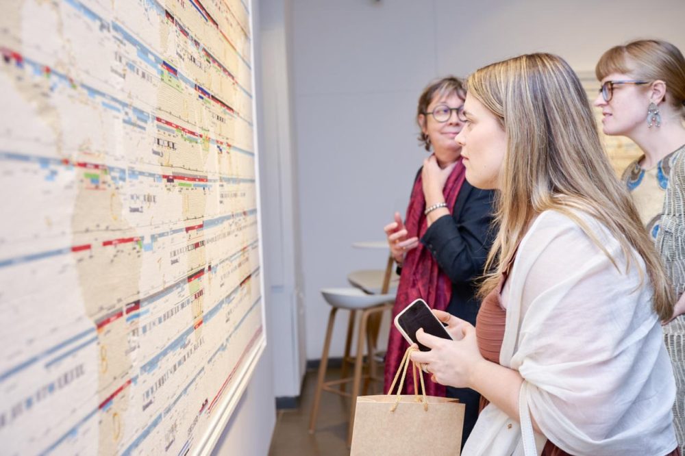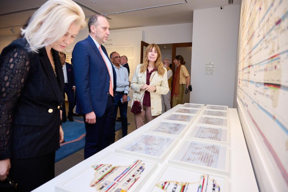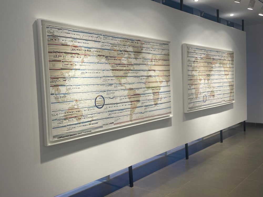 Le mappe siffatte non tracciano confini netti tra Stati o nazioni, ma disegnano flussi che si mischiano. Queste carte geografiche, più che la diversità umana, illustrano una rete di affinità, una trama di differenze e somiglianze che attraversano il pianeta. Invitano a esplorare la geografia più intima del nostro essere, un territorio vasto e intrecciato con fragile grazia. Dice Daniela Papadia: “Ogni ricamo, delicato come un respiro, svela l’armonia nascosta tra ciò che siamo e ciò che siamo chiamati a diventare, mentre il tessuto, logorato dal tempo, porta in sé la memoria di una grazia che sfiora l’usura e il confine della sua stessa esistenza”. Questi sei arazzi, misurano ciascuno di 1,2 x 2,3 metri, raffigurano il mondo attraverso la lente dell’ascendenza materna. Sono stati disegnati da Daniela Papadia e ricamati da diplomati della Chanakya School of Craft e da maestri artigiani dell’atelier Chanakya, sotto la direzione creativa di Karishma Swali.