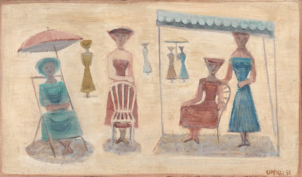 Guarda invece al classicismo Alberto Savinio in Promenade (stima 100-150 mila euro), senza però rinunciare a una sua reinterpretazione. La scena ricorda infatti i dipinti neoclassici cari anche al fratello De Chirico, con la presenza di due cavalli lungo una spiaggia irreale. La coppia è però trasfigurata, resa chimerica dai busti umani, di un uomo e una donna, che trasformano le creature in una sorta di centauri. Sulle stesse cromie tenui si muove anche Estate (stima 35-50 mila euro) di Massimo Campigli, dove troviamo una gruppo di donne borghesi (forse quelle che voleva spaventare Léger?) intente a rilassarsi e prendere il sole. Lo stile, sintetico e dal sapore quasi primitivista, è quello tipico dell’autore. Nel catalogo spicca poi un lavoro di un altro importante autore italiano. Si tratta di Mario Schifano, in asta con Paesaggio anemico (stima 16-20 mila euro), dove ritroviamo alcuni elementi ricorrenti nella poetica dell’autore. L’accenno paesaggistico, qui evidenziato dalla stratificazione orizzontale dei piani e da un accenna di cielo e sole, così come dai cuori pop che accendono l’opera e la punteggiano come un campo fiorito.
