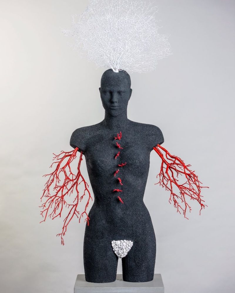Lucia Gangheri e Anna Utopia Giordano, con le loro opere del 2025, offrono una riflessione potentemente contemporanea sul corpo e l’identità femminile, mediata dallo sguardo digitale. Le loro creazioni sembrano caleidoscopi di un presente iperconnesso, in cui il desiderio è algoritmicamente manipolato e l’immagine del sé costantemente mercificata. Miwa Komatsu e Dayla Luttwak, anch’esse presenti con lavori recentissimi del 2025, propongono, in continuità, un confronto tra la natura e la sua riproduzione artificiale. Radici, forme organiche, spiritualità ancestrale si intrecciano con un’estetica cyber e post-naturale, rimandando all’arte calligrafica giapponese. Le loro opere aprono interrogativi sull’origine e sul futuro dell’umano, evocando una nuova sacralità della natura.