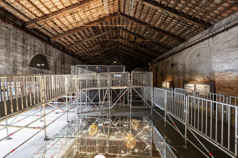 Giunti nella seconda sala, invade lo spazio un ponteggio-passerella d’acciaio, ma dopo i tubi Innocenti dell’installazione ambientale di Massimo Bartolini vista nella Biennale di Arti Visive del 2024, questo catafalco non è armonico perché invade in maniera brutale il bellissimo spazio delle Tese delle Vergini. La struttura metallica, percorribile sopra e sotto, cela – ammantati dal buio tetro del padiglione, progetti, esperienze partecipative, ricerche di università italiane, il lavoro degli enti pubblici e tanto altro ancora, ma non ci invita a restare lì per guardare con calma i materiali esposti. Insomma, usciamo dalla visita del Padiglione Italia frastornati e delusi, perché ancora una volta abbiamo sprecato una importante occasione per mostrare un modus operandi smart, comunitario e connettivo, capace di incanalare il vento della creatività a servizio dell’architettura, dell’ambiente e di una rigenerazione urbana, sociale e culturale, per immaginare nuovi scenari di una Penisola che, da sempre nelle arti e nel progetto, incarna il desiderio del paesaggio, del viaggio e di nuove esplorazioni e conoscenze.