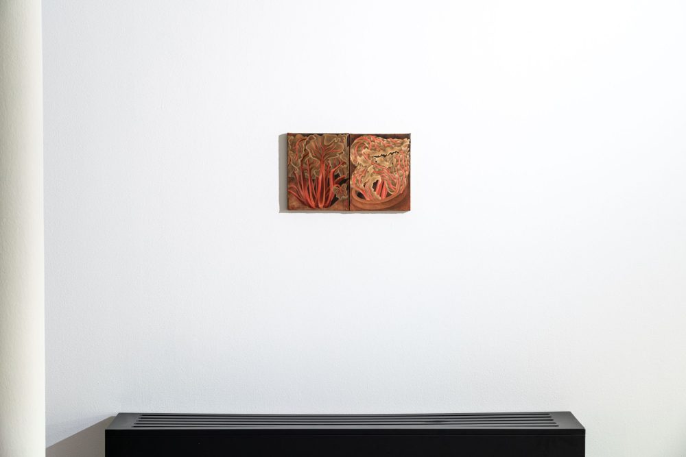 Lipman ci conduce in paesaggi familiari ma sottilmente dislocati, popolati da figure sospese tra sogno e realtà. La sua pittura esplora il senso di smarrimento e silenzio interiore che accompagna il cambiamento, trasformando il quotidiano in uno scenario onirico e inquieto. Hargreaves, invece, attinge alla memoria storica e alla pittura britannica tra le due guerre per raccontare un passato che non è mai davvero concluso. Nei suoi dipinti, l’“affare Galapagos” diventa punto di partenza per riflettere sulla tensione tra natura e cultura, costruendo un tempo ibrido, in cui la memoria diventa materia viva per immaginare nuovi futuri.