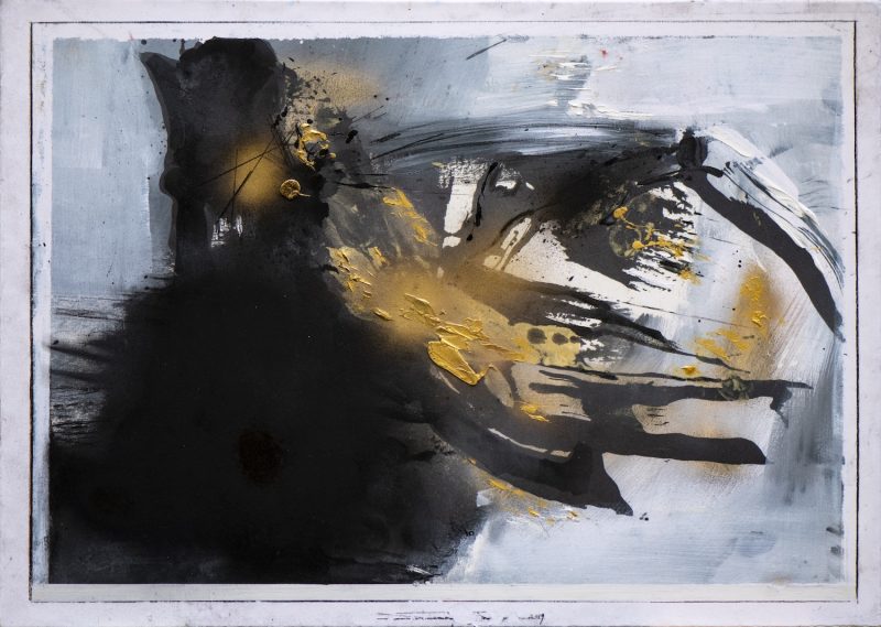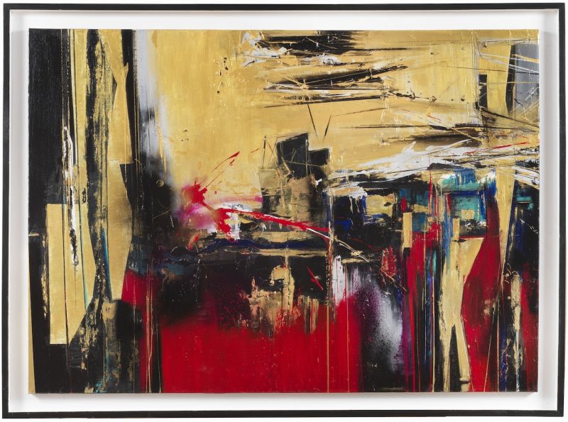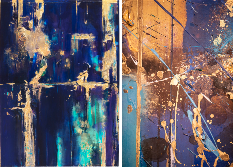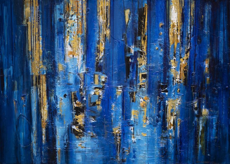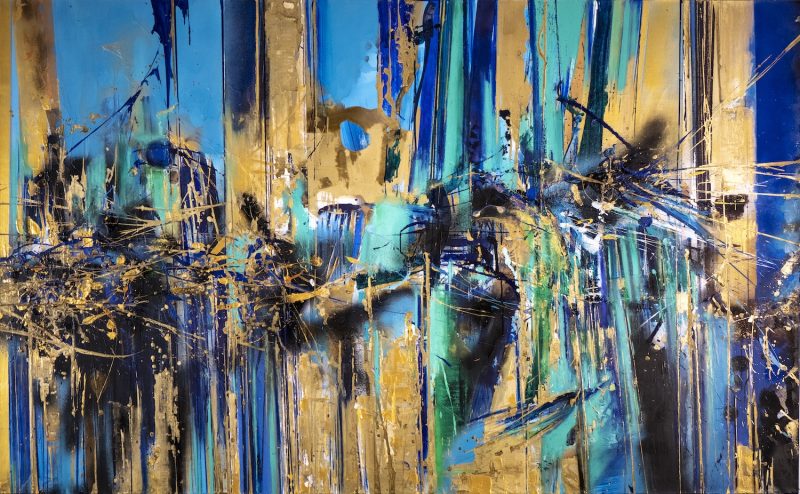 In particolare, nelle opere esposte in mostra – sedici oli e smalti su tela tratti dalla serie Drops from the Gods – la sontuosa presenza dell’oro, spesso posto in rapporto di articolata combinazione con i toni del blu, è un chiaro riferimento alla gamma cromatica che la pittura occidentale ha da tempi remoti adottato per rappresentare il divino. Dagli sfolgoranti mosaici bizantini ai fondi oro della pittura prerinascimentale, arrivando sino alle composizioni di Klimt, la presenza dell’oro, soprattutto se coniugata con il blu, conduce il visitatore in una dimensione oltreumana intrisa di sacralità.
