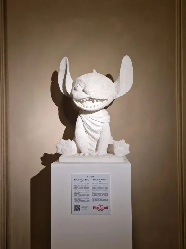 Sì, proprio lui: l’alieno più scatenato del cinema d’animazione, star di Lilo & Stitch, ha fatto il suo ingresso trionfale nel cuore dell’arte fiorentina. E lo ha fatto in grande stile, seduto su un piedistallo di marmo bianco con il suo sorrisone e le orecchie a punta ben in mostra.