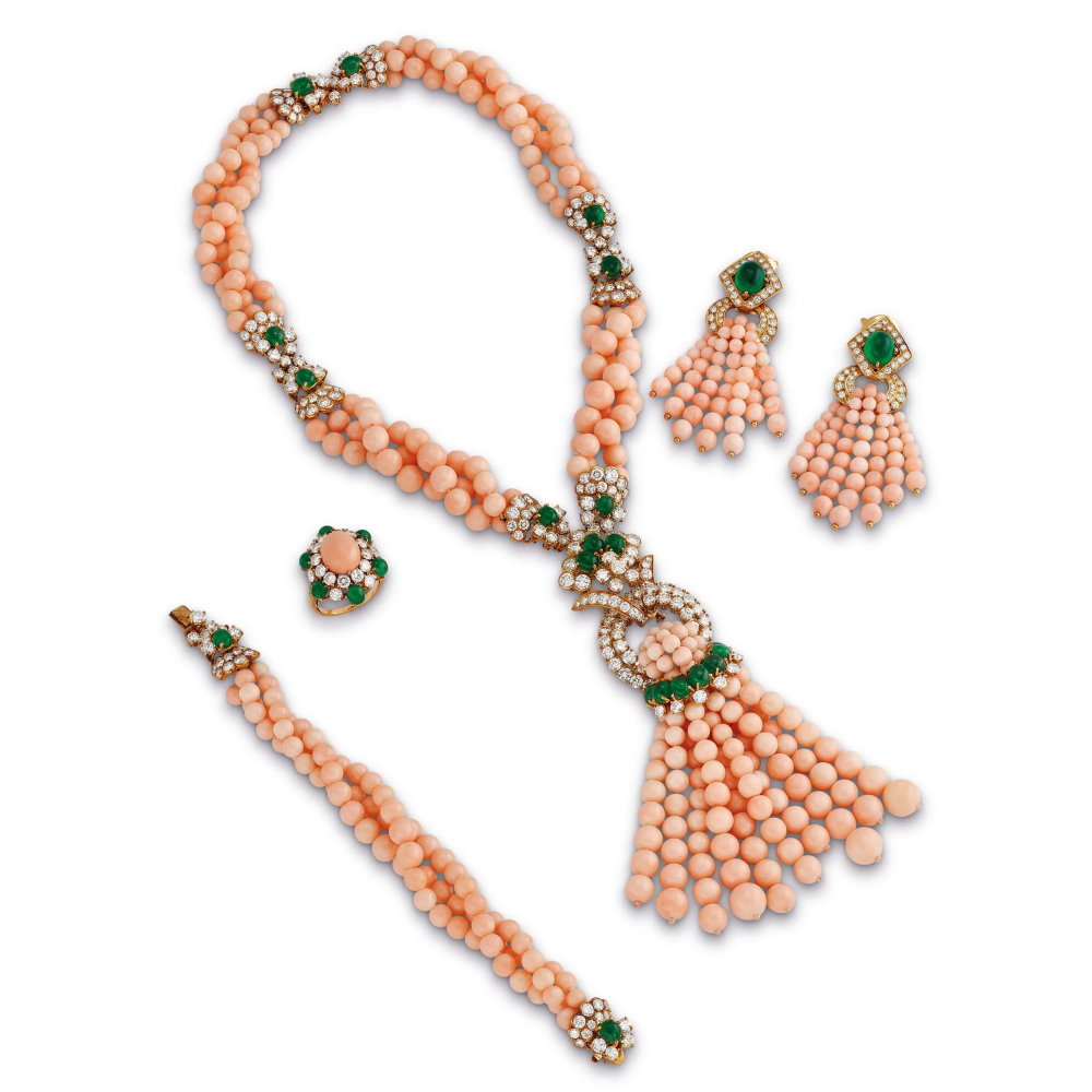 Del gioielliere francese André Vassort si sa poco, come spesso accade con gli artigiani e i laboratori dietro le famose Maison di Place Vendome, a Parigi. Sappiamo che era uno dei produttori di gioielli più riconosciuti e ricercati della metà del XX secolo. A lui si affidavano Van Cleef & Arpels, Boucheron e Mauboussin. Ma anche Louis Gérard, che nell’atelier di Vassort realizzò uno dei suoi gioielli più celebri: la parure con corallo rosa, smeraldi e diamanti, che oggi guida l’asta di Pandolfini alla stima di 60-90 mila euro. Realizzata in oro giallo 18kt, il gioiello è composto da soutoir, bracciale, anello e paio di orecchini a clip pendenti. La parte terminale della collana è smontabile e convertibile in spilla, realizzata insieme agli orecchini a forma di nappe con fili di boules in corallo. Il tutto è impreziosito da smeraldi taglio cabochon per ct 18 circa, e diamanti taglio brillante per ct 37 circa.