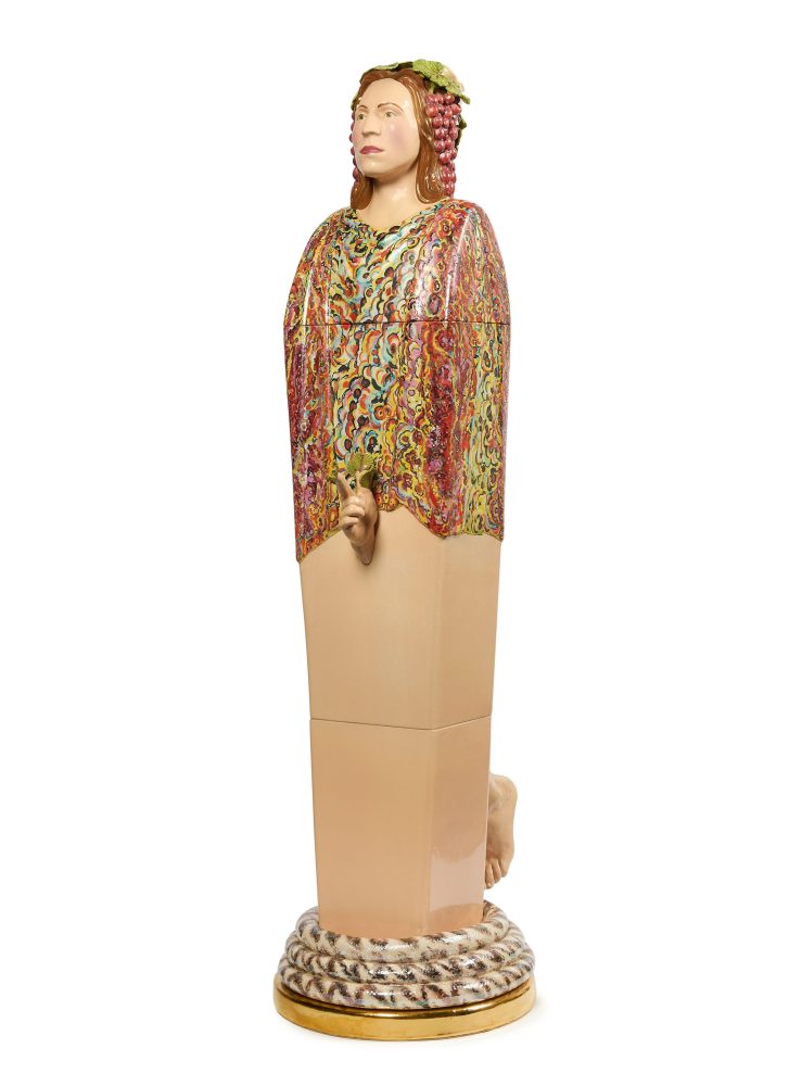 Ugualmente iconica è l’ErmEstetica Borghese (2002) di Luigi Ontani, stima 70-100 mila euro, una scultura in ceramica policroma e oro zecchino realizzata in collaborazione con la Bottega Gatti di Faenza. L’opera riprende la forma dell’erma classica, ma la trasfigura secondo la poetica visionaria e colta dell’artista, in un gioco di rimandi mitologici, allusioni erotiche e riferimenti all’arte neoclassica, in particolare alla figura di Paolina Borghese. L’opera si inserisce nel ciclo delle “erme estetiche”, tra le più celebrate della sua produzione plastica.