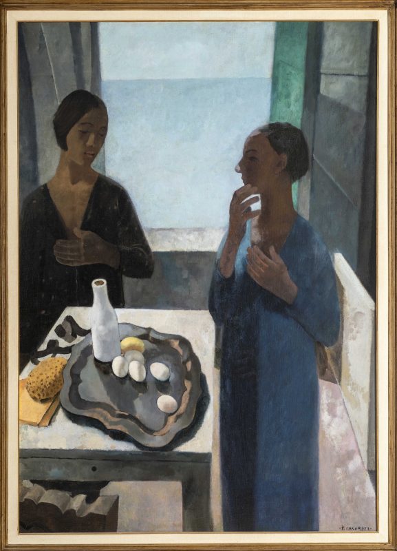 Tra i Capolavori degli anni trenta 1933-1937 emergono Daphne a Pavarolo (1934), la moglie dell’artista incorniciata attraverso la finestra dal verde delle colline del piccolo e riposante centro e dal grigio del cielo, panorama che, riflettendosi nei vetri, dilata gli spazi, Donne in barca (1933) e altri quadri dove predomina il tema della maternità come ne Le sorelle Pontorno (1937) dove Casorati riprende insieme la tematica delle sorelle, costante nella sua poetica.