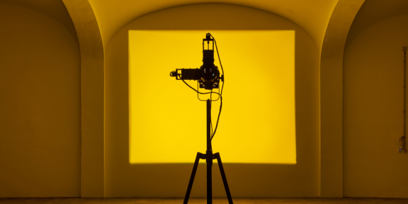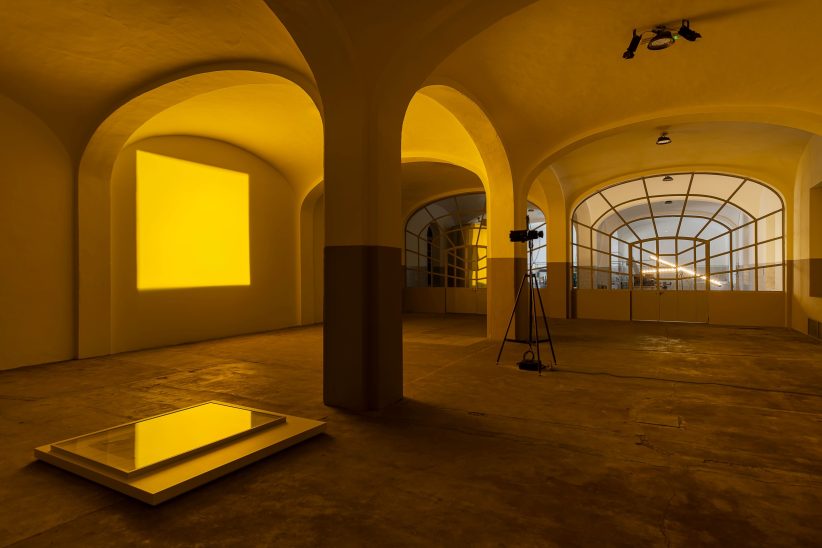 La mostra di Gabellone, curata da Giorgio Galotti, si inserisce perfettamente in questo programma, offrendo un percorso che indaga il rapporto tra pieni e vuoti, presenza e assenza, luce e ombra. L’artista ha realizzato per l’occasione un’opera site-specific, Tramonto scivola, un’installazione che invita al raccoglimento interiore. Un proiettore motorizzato movimenta lentamente un quadrato di luce gialla, simbolo solare, che si sposta, si restringe e infine si dissolve nello spazio.