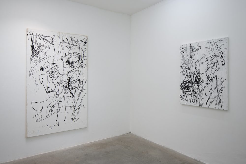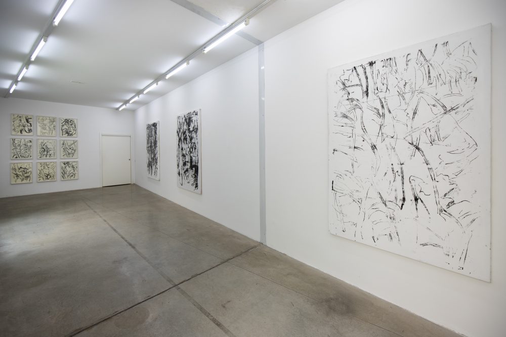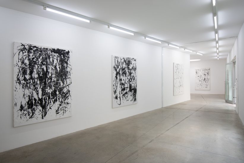 La condizione rimane la medesima, e sta qui la posta in gioco: egli intuisce nella pittura l’impossibilità di anteporre una visione d’insieme del soggetto considerato alla dinamica che esso impone. Linee e segni distesi nei toni del nero, assuefatti in parte dallo sfondo bianco, che alternatamente si pone in secondo piano quando la grammatica del colore si fa più densa. Una grammatica tutta sua che, più che venire esplicitata, pare giocare con le giustapposizioni delle forme che via via emergono e si fanno strada tra una tela e l’altra.