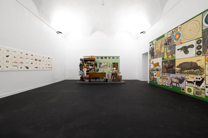 Mitologicamente (in)definito e presente al netto della sua assenza, l’entomologo malinconico pare aver lasciato proprio un attimo fa il suo studio pieno di cose. E quando diciamo pieno, intendiamo per davvero: carte, retini, provette e oggetti di cui non sapremmo nemmeno definire l’uso. Non è nemmeno granché ordinato, o non lo è semplicemente perché quello è il suo e non il tuo studio, quello è il suo e non il tuo ordine. Sicuramente è vissuto nell’affastellarsi di cose sulla scrivania, sul tavolo, sotto la scrivania, dietro il tavolo e tutto intorno fino alla libreria, che per essere in linea con questo nuovo progetto di Mark Dion è stata privata delle ante a vetri, come ci racconta Antonella Berruti di Pinksummer.