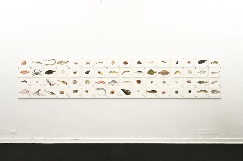 Discorso analogo per la parete di 64 varietà ittiche prese in un mercato del pesce sudcoreano, fatte acquarellare da maestranze locali, in un passaggio dal reale al fittizio irreversibile come i danni portati all’ecosistema marino da una pesca non sostenibile. E, ancora, per quel pinguino di ceramica sul fondo della sala a fianco, in cima a un secchio pieno di oggettini recuperati e immerso nel bitume. Il messaggio è chiaro, ma guai a non considerare la colonnina in legno (altro elemento rigorosamente Dion-approved) che lo sottolinea, riportandolo a una dimensione comoda e casalinga, alla portata di tutti e mirata a tutti. In altri tempi ci avremmo messo sopra magari un vaso di fiori, così come l’avremmo vista contestualizzata in altre sedi e in altri momenti. Ma oggi è così che abbiamo scelto di far andare le cose.