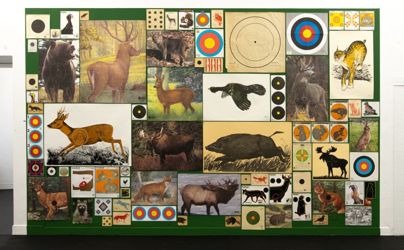 A destra, il Target Wall composto con incastri precisi è altrettanto preciso nella sua “dionicità” assoluta, con immagini di animali che, a loro volta, incastrano non meno precisamente una pseudo-bucolicità animale alla prospettiva di morte imposta dall’uomo, segnata nei punti vitali da colpire specie per specie, su una parete che l’artista ha voluto verde intenso. Un verde contestualizzante, un verde-bosco allegorico racchiuso in un messaggio tutt’altro che allegorico, perché intendere e non sottintendere è regola non scritta per Dion, che su quel muro riesce a rendere la convivenza non pacifica tra essere umano e animale leggibile in tutte le lingue del mondo.