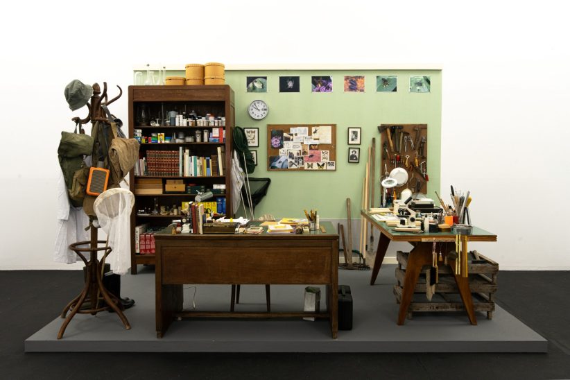 Mitologicamente (in)definito e presente al netto della sua assenza, l’entomologo malinconico pare aver lasciato proprio un attimo fa il suo studio pieno di cose. E quando diciamo pieno, intendiamo per davvero: carte, retini, provette e oggetti di cui non sapremmo nemmeno definire l’uso. Non è nemmeno granché ordinato, o non lo è semplicemente perché quello è il suo e non il tuo studio, quello è il suo e non il tuo ordine. Sicuramente è vissuto nell’affastellarsi di cose sulla scrivania, sul tavolo, sotto la scrivania, dietro il tavolo e tutto intorno fino alla libreria, che per essere in linea con questo nuovo progetto di Mark Dion è stata privata delle ante a vetri, come ci racconta Antonella Berruti di Pinksummer.
