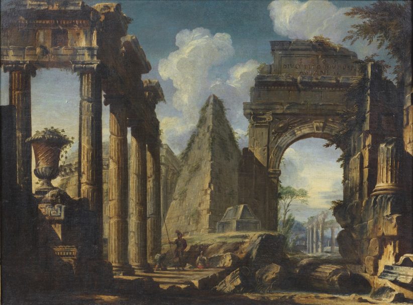 Capriccio architettonico con la Piramide Cestia, l’Arco di Tito e soldati