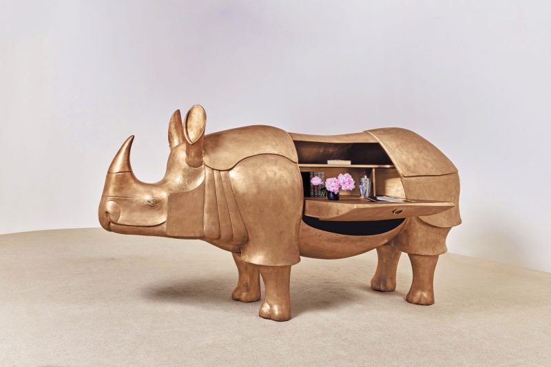 L’opera, una scultura in bronzo dorato che si apre rivelando uno scrittoio, è uno dei lavori più iconici del geniale duo François-Xavier e Claude Lalanne, noti per l’approccio poetico e surreale al design. Realizzato in bronzo con finitura dorata patinata, Grand Rhinocrétaire II incarna l’essenza della visione di Lalanne: coniugare scultura e funzionalità, stupore e utilità. Dietro la forma imponente del rinoceronte si cela una scrivania perfettamente attrezzata, che trasforma un oggetto decorativo in uno spazio creativo intimo.