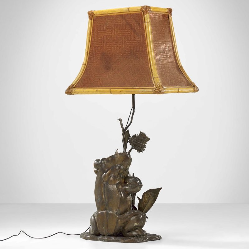 Tra i nuclei più significativi, spicca quello dedicato a Gabriella Crespi, icona dello stile italiano. In evidenza il Lotto 80, una scenografica lampada da terra della serie Animali, modello Rana con Cardo, in bronzo, rattan e paglia intrecciata, datata 1973 e stimata tra i 10-12 mila euro.