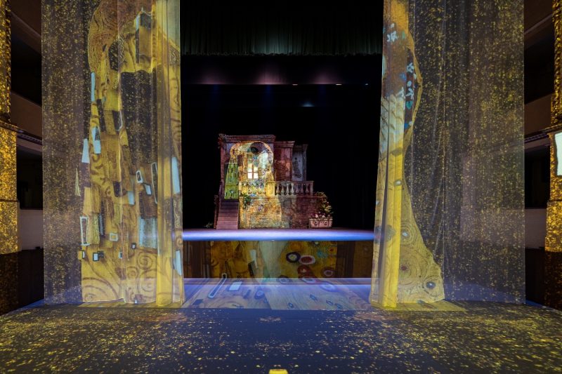 Le luci si spengono e il teatro si trasforma. Lo spettatore è totalmente libero di muoversi nello spazio e di cambiare punto di vista e di ascolto. Frutto di un importante lavoro contenutistico e architettonico, questo “poema visivo” apre ripercorrendo la vita di Klimt e il contesto della Secessione Viennese, per proseguire con un omaggio a Romeo e Giulietta in una Verona del tutto nuova e frutto di una rielaborazione dall’IA a partire da stampe e vedute dell’epoca. A chiudere lo spettacolo è la proiezione dell’opera L’Albero della vita di Klimt. Ma non è tutto qui.