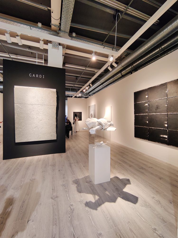 Cardy Gallery apre la sua presentazione con un’imponente pietra che Giovanni Anselmo ha applicato su tela, manifesto poverista che riecheggia nei ferro, carte e pastelli a olio di Jannis Kounellis che la avvolgono, con le frasi di Agnetti e i manichini di De Chirico ad alleggerire l’atmosfera