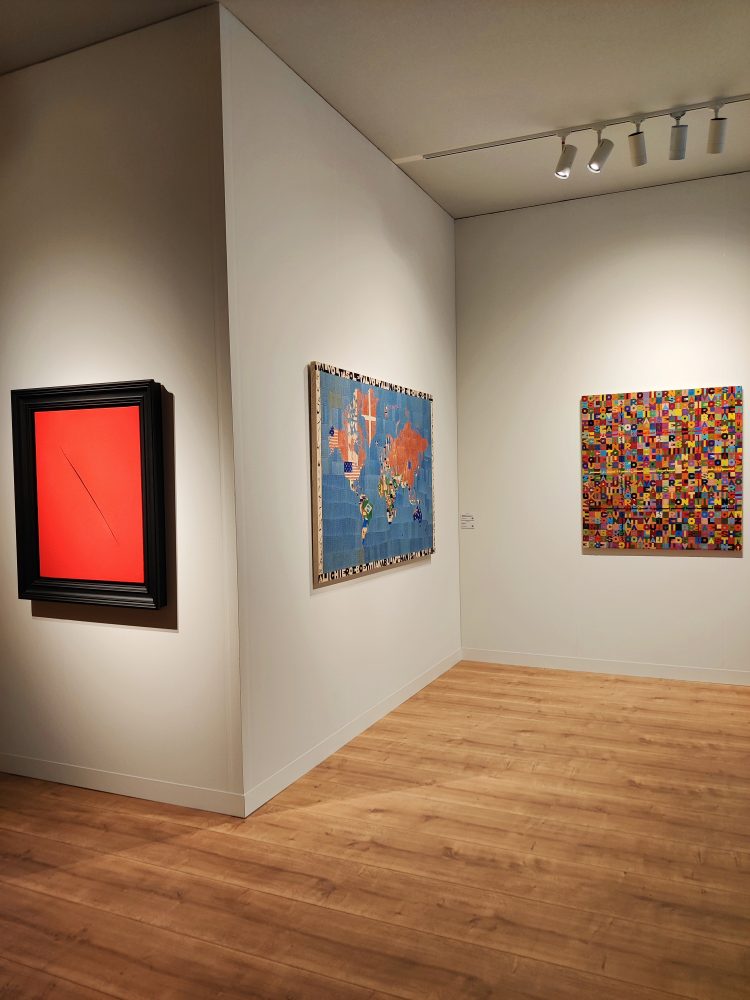 Mappe (di Boetti) che illustrano mondi, Tagli (di Fontana) che li aprono, permettendo a ai visitatori di Tornabuoni di ammirare eccellenze italiane come anche Burri e Paolo Scheggi