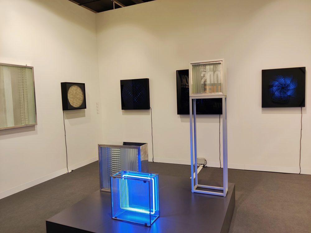 Lo stand di Galleria Continua si specchia nel Double Return di Anish Kapoor, che si riflette a sua volta in un Pistoletto tagliato di blu.