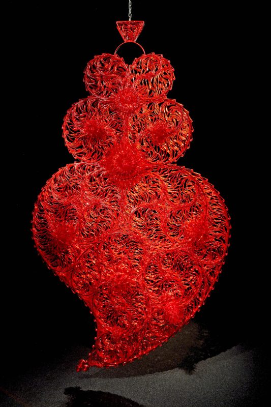 “Flowers of My Desire” è un progetto profondamente simbolico: riunisce opere di periodi diversi che, seppur distinte, condividono una metafora di trasformazione, seduzione e resistenza. Il fiore, nel mio lavoro, non è mai decorativo: porta con sé una tensione latente tra fragilità e potere. Ad Ascona, sono rimasta particolarmente colpita nel vedere di nuovo vicine Coração Independente Vermelho e Marilyn. Entrambe parlano di archetipi femminili: il cuore come contenitore di emozioni, la scarpa come simbolo di glamour e costrizione, ma anche di autonomia decisionale e ribellione. Riunire queste opere nel contesto unico del Museo Comunale ha permesso di far emergere nuove risonanze.
