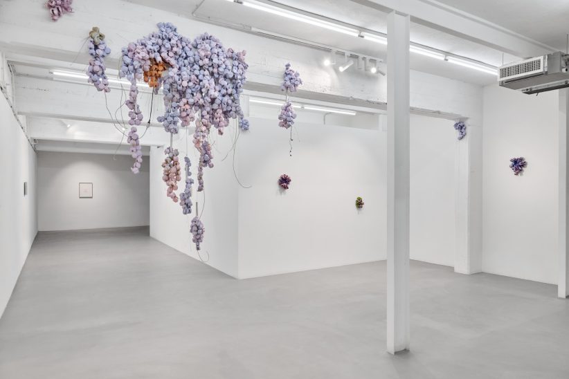 In questa nuova personale, l’artista continua a mettere a fuoco la sua ricerca sull’idea di paesaggio e della sua rappresentazione. Un florido glicine, con i suoi racemi carichi di foglie, scende dalla volta candida della galleria. Parrebbe ondeggiare leggermente, forse mosso da uno spiffero d’aria. Ma a ogni passo verso di esso, la scena si rivela sempre più straniante: non si tratta affatto di una pianta, bensì di un bizzarro accumulo di fili elettrici e ruote da sedia d’ufficio – o meglio, calchi in ceramica o cemento – mossi da un piccolo motorino. Sono oltre duemila elementi, risultato di un’elaborazione di Staccioli che imita ironicamente la produzione industriale. Ma la reiterazione ossessiva ha finito per logorare le matrici con cui sono stati realizzati, differenziando di fatto ogni singolo pezzo: da quelli ancora nitidi e dettagliati, ad altri ormai consumati e lisi. Sabotage of a Working Day, Flowers è il titolo dell’opera, lo stesso che porta anche la costellazione di grappoli di rotelle più piccoli, disseminati sulle pareti.