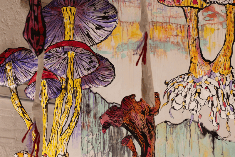 La mostra si apre a Malga Costa con tre diorami in carta, installati nelle nicchie dello spazio espositivo. Tra i protagonisti, il Bostrico Tipografo (Ips typographus), minuscolo coleottero che ha trovato terreno fertile tra gli alberi abbattuti dalla tempesta Vaia, cambiando radicalmente il volto del paesaggio. Nella Malga, il visitatore è accolto da un’installazione immersiva realizzata in carta e cartapesta: un universo onirico, in continua metamorfosi, popolato da esseri immaginari. Un ecosistema alieno eppure familiare, che invita a ripensare le gerarchie tra umano e non umano.