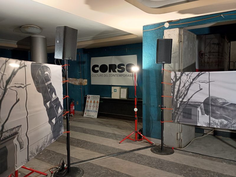 La cosa interessante è che questa Caduta del cielo – “un sistema di sei altoparlanti” che diffonde un tappeto sonoro fatto di frammenti e innesti, da cui sembra emergere una sorta di drammaturgia e “tre immagini della caduta di una torre piezometrica, scattate dall’artista, in occasione del suo abbattimento” – è installata nel foyer di un ex cinema piazzato nel cuore della città ma chiuso ormai da trent’anni che Fondazione Roi ha acquistato per restituirlo alla città come centro culturale (grazie alla guida di Francesca Lazzari). Si tratta del primo passo di una riapertura lungamente attesa, un primo passo compiuto anche segnalando con precisione quella che si presume e spera sarà la rotta che l’ex cinema Corso terrà nei prossimi anni. Sull’opera in mostra c’è poco da dire, nel senso che era un “dispositivo” ben congegnato, equilibrato ed evocativo, calato molto bene nel contesto – in effetti, un cantiere con il quale dialogava attraverso una sorta di controcanto: se con La caduta del cielo l’artista alludeva a un momento di crollo, di distruzione e perdita, al contrario il luogo raccontava di una ricostruzione, di uno sforzo di rinascita.