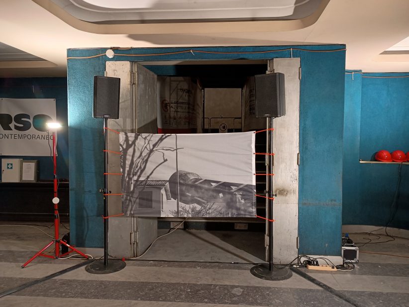 La cosa interessante è che questa Caduta del cielo – “un sistema di sei altoparlanti” che diffonde un tappeto sonoro fatto di frammenti e innesti, da cui sembra emergere una sorta di drammaturgia e “tre immagini della caduta di una torre piezometrica, scattate dall’artista, in occasione del suo abbattimento” – è installata nel foyer di un ex cinema piazzato nel cuore della città ma chiuso ormai da trent’anni che Fondazione Roi ha acquistato per restituirlo alla città come centro culturale (grazie alla guida di Francesca Lazzari). Si tratta del primo passo di una riapertura lungamente attesa, un primo passo compiuto anche segnalando con precisione quella che si presume e spera sarà la rotta che l’ex cinema Corso terrà nei prossimi anni. Sull’opera in mostra c’è poco da dire, nel senso che era un “dispositivo” ben congegnato, equilibrato ed evocativo, calato molto bene nel contesto – in effetti, un cantiere con il quale dialogava attraverso una sorta di controcanto: se con La caduta del cielo l’artista alludeva a un momento di crollo, di distruzione e perdita, al contrario il luogo raccontava di una ricostruzione, di uno sforzo di rinascita.