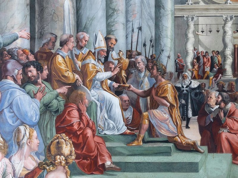 La Sala di Costantino, dedicata al primo imperatore romano convertitosi al cristianesimo, è la più grande delle quattro stanze affrescate tra il 1508 e il 1520. Commissionate da Papa Giulio II a un Raffaello poco più che ventenne, queste stanze dovevano celebrare la potenza spirituale e temporale della Chiesa. Oggi, grazie a un paziente lavoro durato dieci anni, tornano a splendere in tutto il loro splendore originario.
