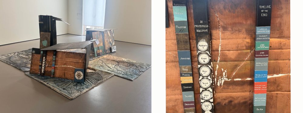 Si potrebbe ribaltare l’obiezione in senso positivo e dire che la cosiddetta estetica dell’abbietto era andata fin troppo oltre e che è venuta l’ora di una rivalutazione dello studio – laboratorio dove l’artista ritorna non per trovare un’autenticità irraggiungibile ma la felicità di un artigianato che ritorna a sfoderare manufatti avvincenti. La voglia di superare la brutalità dell’oggetto nudo e crudo è ad esempio evidente nella grande installazione “The Great Atlas od Disorientation” dove si immagina un ritrovamento di un albo tridimensionale che registra tracce e immagini di ere lontane e future.