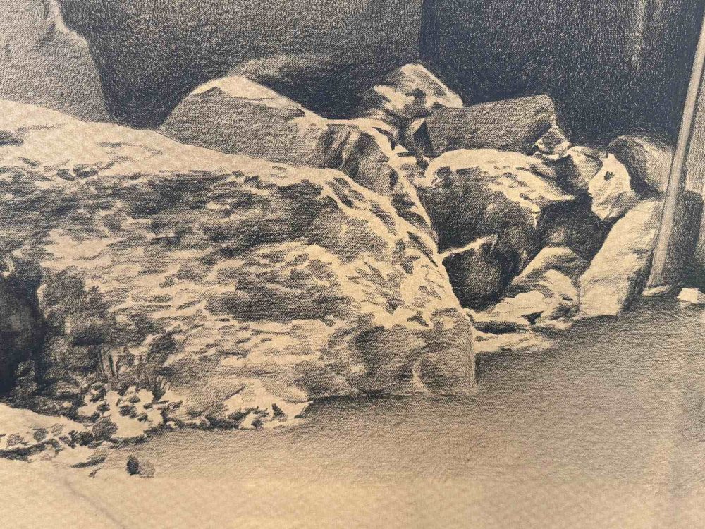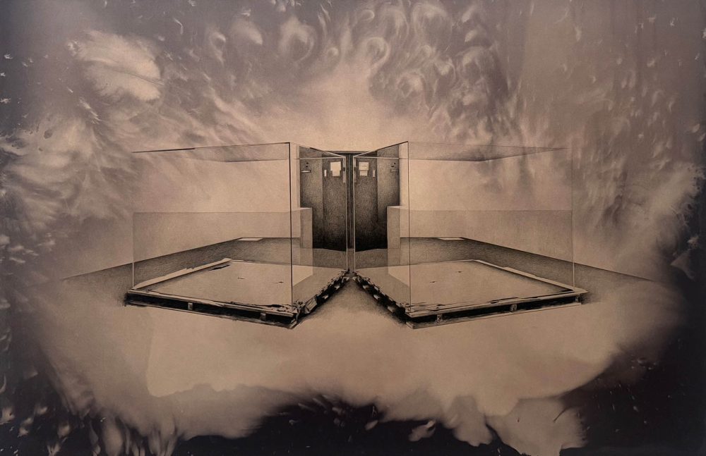 Il secondo piano della mostra è maggiormente dedicato alla parte grafica dell’attività dell’artista che consiste in bellissimi disegni su grandi carte: le referenze derivano da immagini fotografiche di vari soggetti , spesso installazioni predisposte dall’autrice , trattate prima al computer con vari effetti di Photoshop che hanno sostituito le vecchie “solarizzazioni” fotografiche, dove mescola spesso in trasparenza anche altre foto, di pennellate o chiazze di vernice, e alla fine proietta il tutto sulle carte tratteggiandolo poi meticolosamente a matita. Il tutto è quasi sempre bello, niente da dire, ma si ha l’impressione di una serie di espedienti che per quanto ben gestiti non si ricollegano a nulla di effettivo fuori di essi. L’effetto da prospettive aeree rischia di suonare stucchevole.