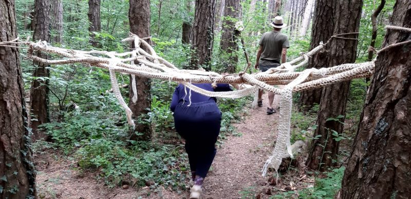 Prima di tutto, per il workshop organizzato dal 29 al 31 maggio con gli artisti Andrea Caretto e Raffaella Spagna, esperti di arte pubblica, che da oltre vent’anni lavorano su temi ecologici, affrontando in anticipo questioni oggi attuali come la relazione e l’interdipendenza di umano e non umano. Un’esperienza raccolta nella monografia “Bright Ecologies. Caretto/Spagna: Experiences, Forms, Materials”, che è stata presentata all’Accademia di Firenze da una delle curatrici, Cecilia Guida. I professori dell’Accademia di Firenze, Marcella Anglani e Robert Pettena, hanno selezionato gli studenti e le studentesse interessati a tematiche ambientaliste, che hanno partecipato al workshop. È importante sottolineare che la ricerca transdisciplinare di Caretto/Spagna è spesso praticata attraverso workshop, giochi e momenti di condivisione e convivialità in diversi ambiti pubblici e privati. Passando dall’Accademia di Firenze, sono stati coinvolti anche gli abitanti di Castagno d’Andrea, grazie alla partecipazione di tutto il gruppo alla cena sociale, l’ultimo Venerdì del mese e al conseguente incontro con Don Bruno.