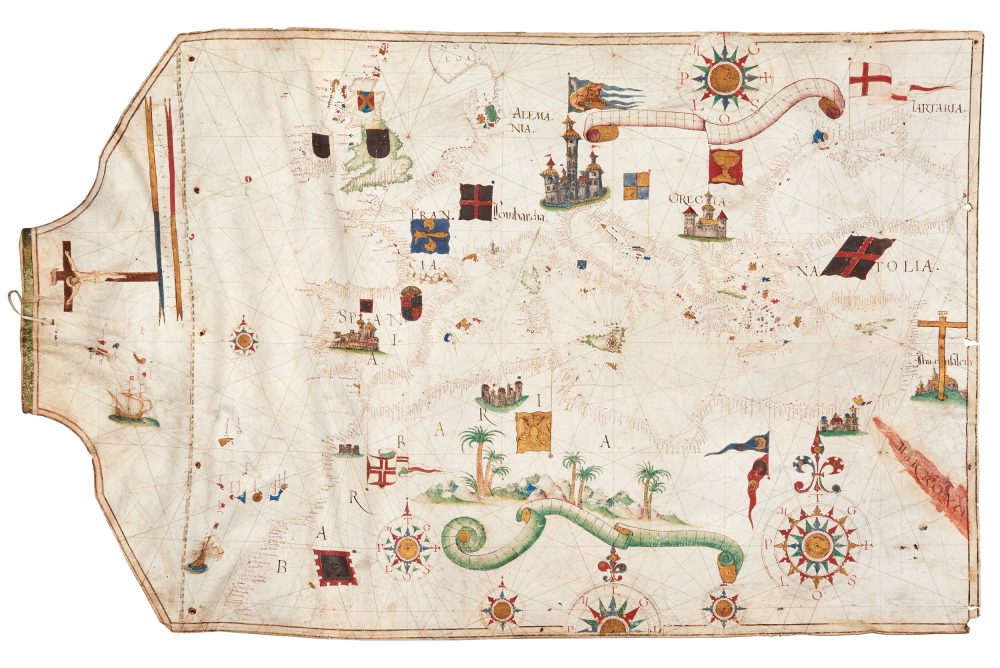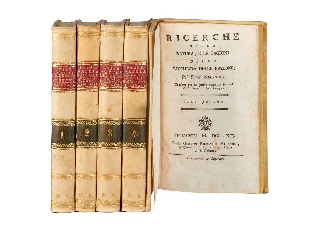 Tra i pezzi principali, un raro portolano iberico manoscritto su pergamena, realizzato nella seconda metà del XVI secolo. Caratterizzato da coste miniate, stemmi araldici e città idealizzate, è attribuibile all’ambito di Luis Teixeira. Stima 50-80 mila euro. Fra i testi fondamentali, spicca pii la prima edizione italiana della Ricchezza delle Nazioni di Adam Smith, pubblicata a Napoli nel 1790. Edita in cinque volumi, rappresenta uno dei principali veicoli del pensiero economico moderno in Italia e stima 15-25 mila euro. Si tratta di un esemplare completo, in legatura coeva in pergamena rigida, con titoli su tasselli e barbe conservate: un monumento editoriale che non è solo il riflesso della cultura napoletana tardo-settecentesca, ma anche l’esito più alto della diffusione in Italia del pensiero economico di matrice scozzese, in dialogo con le teorie di Genovesi, Galiani, Vico e Filangieri.