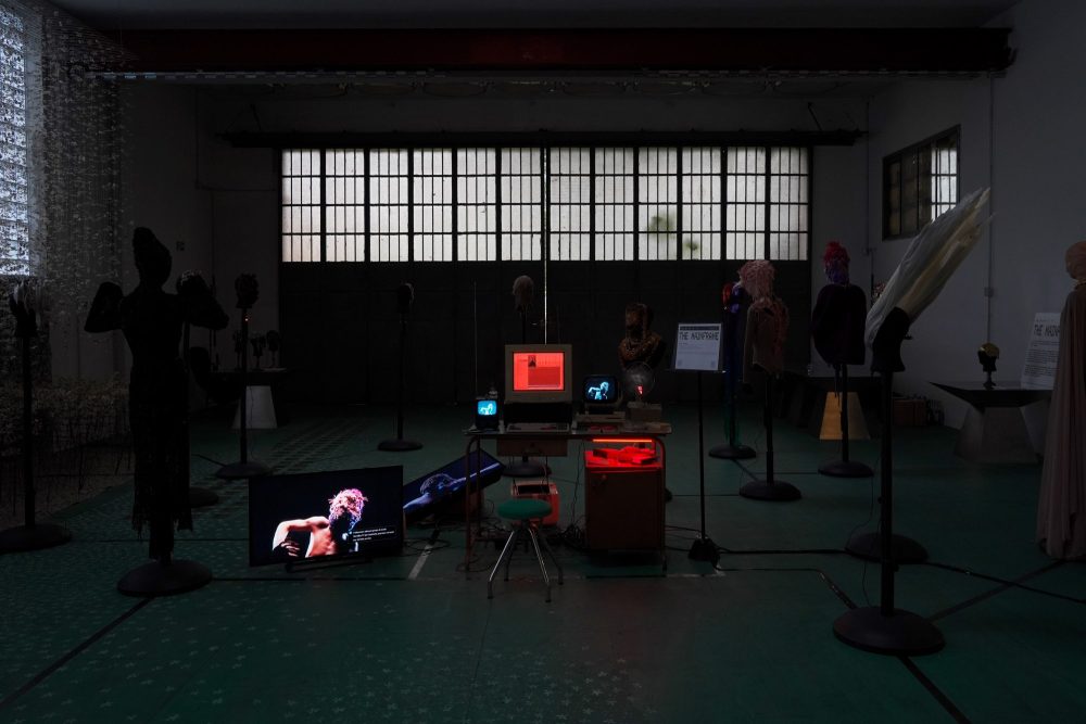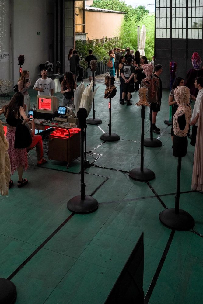 Elisabetta Giovi: Tradurre un’idea artistica come ‘The Mainframe’ in uno spazio concreto, multidimensionale e multimediale è stato un lavoro di equilibrio tra concetto e materia, tra visione e percezione. Ogni scelta, dalla disposizione degli elementi alla selezione dei materiali, ha contribuito a costruire non solo un ambiente visivo, ma anche un’atmosfera emotiva, capace di evocare sensazioni profonde nel pubblico. L’obiettivo era creare un dialogo fluido tra le maschere d’artista, le personalità generate in AI, il film che le racconta e lo sguardo dell’osservatore. La ricerca dei props per il set design è stata centrale: Ced e io volevamo che ogni oggetto evocasse un’estetica “sospesa nel tempo”, coerente con la narrativa dell’installazione. Abbiamo selezionato pezzi vintage autentici, capaci di dialogare con l’architettura dal sapore industriale dello spazio dedicato all’interno della Fondazione Sozzani, che ha avuto un ruolo chiave nell’identità visiva del progetto. Lavorare all’intersezione tra arte, tecnologia, moda e design significa per me costruire ponti narrativi tra linguaggi differenti, senza mai perdere coerenza estetica. In questo caso, l’unione tra le maschere-scultura di Agglomerati e la dimensione interattiva dell’AI sviluppata da FullScream ha dato vita a un’unica narrazione multistrato, che ha coinvolto i visitatori su diversi livelli sensoriali e concettuali. La direzione artistica ha voluto riflettere proprio questo: un sistema complesso ma leggibile, in cui ogni elemento, dallo spazio fisico alla luce, dalle texture alla palette colori, dal design dei vintage oggetti selezionati con cura all’interfaccia AI, fino al sound design e all’invito, ha contribuito a rendere l’esperienza immersiva, ipnotica e visivamente potente. La fusione di questi linguaggi ha generato un’energia coinvolgente, portatrice di un’esperienza dal valore artistico totalizzante e profondamente visionario.