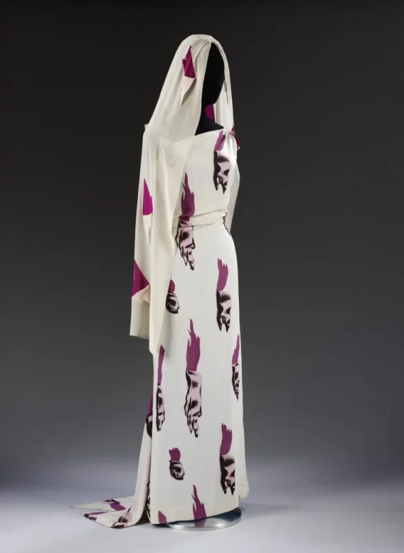 Ed è proprio il dialogo con il Surrealismo a costituire il cuore pulsante della mostra londinese. In esposizione ci saranno alcuni dei suoi capi più celebri, frutto di alleanze visionarie con artisti come Salvador Dalí, Jean Cocteau, Meret Oppenheim, Man Ray. Il Tears Dress, l’Abito Aragosta, il celebre Cappello Scarpa, il Cappotto-Vaso: tutti oggetti che sembrano usciti da un sogno – o da una tela – e che sfidano le convenzioni dell’abito come semplice ornamento.