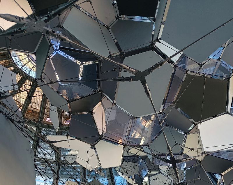 Un’Utopia, appunto. E, infatti, alla base della scala di accesso alla nuvola su cui Saraceno ci invita ad arrampicarci per elevare di qualche metro il nostro pensiero, c’è una didascalia in cui l’artista rende esplicito il suo intento: «un regno sospeso in cui incontrarsi e conversare in modo diverso… un’opera immersiva, un invito ad abitare il tempo condiviso… e a considerare costellazioni alternative della sfera pubblica urbana, architetture speculative e crisi ambientale, all’interno di una rete intricata di vita… la scultura interattiva ci invita a guardare dentro e fuori, a ripensare il concetto di osservatorio del XXI secolo e a immaginare la molteplicità di mondi manifestati nelle forme mutevoli delle nuvole in transito».