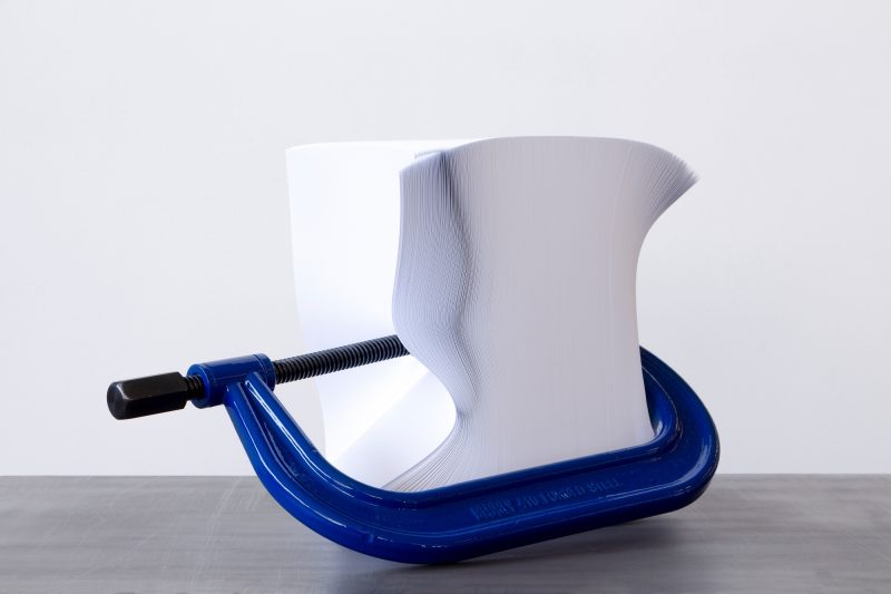 Quel senso tutto suo lo si intuisce attraverso due concetti espressi dall’artista vicentino, fondamentali per capire il suo lavoro: «Mi piace che ci sia una tensione reale nella scultura» e, sempre in riferimento a quest’ultima, «Prima che diventi metafora, mi interessa che sia essa stessa soggetto». Dalla prima frase è chiaro come la scultura secondo Sassolino non sia una certezza assoluta, piuttosto un sistema di forze espresse, che finché saranno uguali e contrarie daranno esistenza alla scultura stessa: un morsetto (verde brillante, non proprio un dettaglio se la sua funzione sarà altra da quella per cui è stato concepito) che stringe una risma di carta appoggiata su un ripiano non è un’opera in sé, ma lo è solo in virtù della forza che il morsetto stesso applica nel comprimere la carta. Questa è Resistenza bianca. Stesso discorso vale per le lastre di marmo sospese di Geografia del conflitto, tenute assieme anch’esse da un morsetto, con l’aggiunta che in questo caso si palesa il Sassolino-pensiero di una scultura “soggetto” prima che “metafora”. Una scultura esistente di per sé prima che portatrice di messaggi più o meno diretti o latenti, anche perché siamo dell’idea che l’opera di Sassolino sia tra le migliori su piazza nel funzionare in aperta visione/percezione, stile macchie di Rorschach tanto per dare l’idea. Il paradosso è, semmai, arrivare a dire ciò al netto dell’utilizzo di oggetti che di per sé poco lascerebbero all’immaginazione.