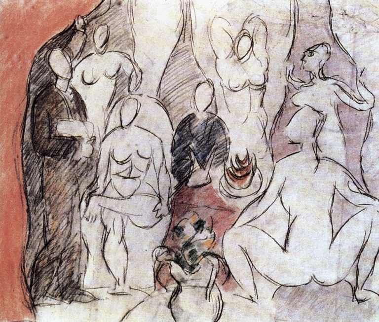 Più che un caso da risolvere in bianco e nero, quello delle Demoiselles si rivela un affascinante enigma a tinte multiple. Per alcuni, è l’eco delle grotte preistoriche. Per altri, l’influenza delle antiche sculture iberiche. E ancora: Giotto, Cézanne, Matisse ecc… Un caleidoscopio visivo da cui Picasso ha attinto senza sosta, con lo spirito famelico di chi guarda il mondo come un archivio da reinventare.