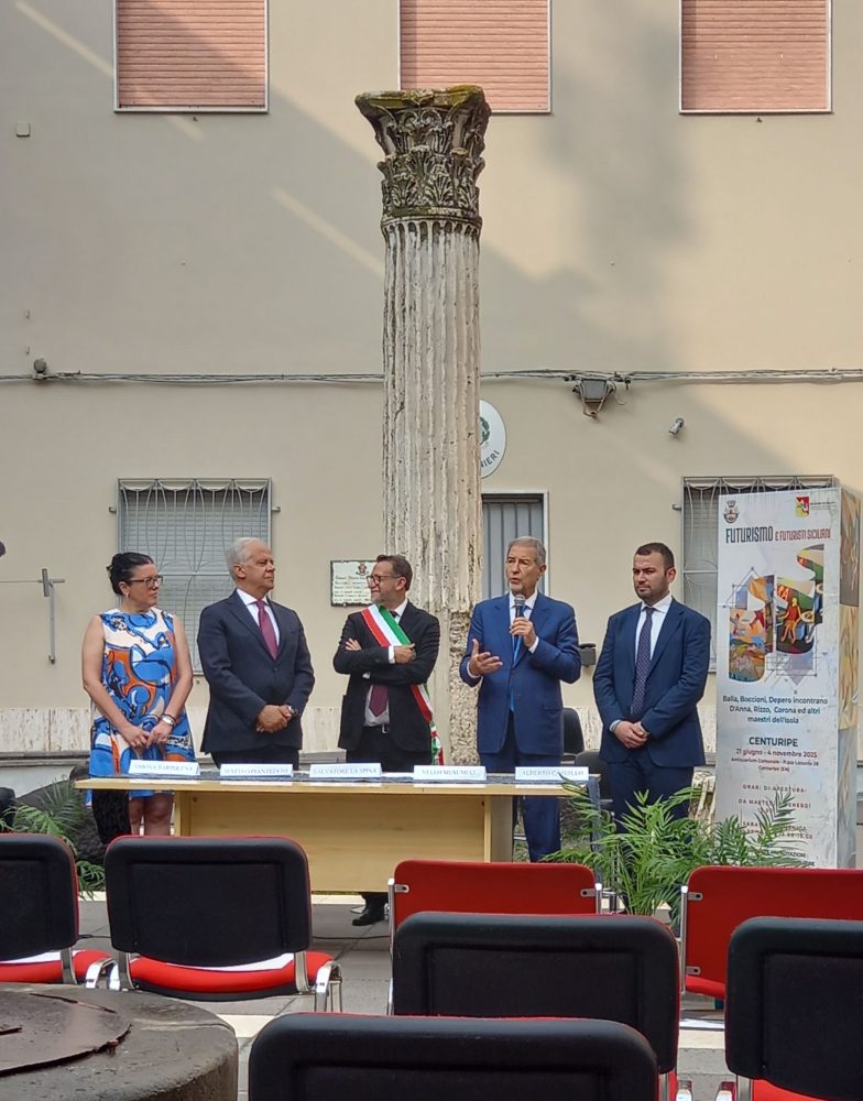 L’inaugurazione della mostra Futurismo e Futuristi Siciliani si è svolta alla presenza del Ministro dell’Interno Matteo Piantedosi e del Ministro per la Protezione civile e le Politiche del mare Nello Musumeci, i quali hanno espresso vivo apprezzamento per la qualità del progetto espositivo e si sono complimentati con il Sindaco per la visione e la determinazione con cui ha saputo fare di Centuripe un punto di riferimento culturale nazionale. La coerenza di questa azione amministrativa affonda le radici nell’esperienza di La Spina. Originario di Centuripe, storico dell’arte laureato a Firenze, con oltre trent’anni di attività nel settore culturale. Dopo una lunga carriera – dove si è occupato della comunicazione per istituzioni quali le Gallerie degli Uffizi, la Galleria dell’Accademia e il Museo del Bargello – è tornato al proprio paese per mettersi al servizio della sua comunità. Da Sindaco, ha promosso un ambizioso progetto di rilancio culturale del territorio. Avviando sinergie con importanti istituzioni museali italiane e riportando l’arte al centro della vita pubblica del paese.