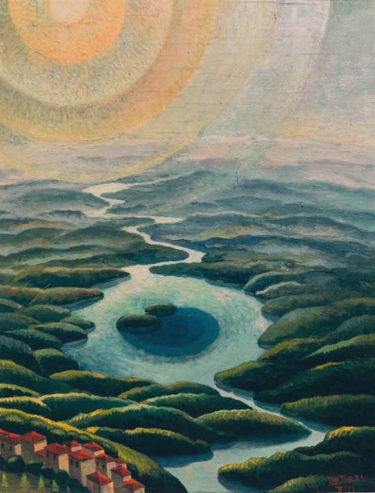 Una delle sezioni più suggestive della mostra è dedicata all’Aerofuturismo, un ambito in cui l’immaginario futurista si spinge oltre la celebrazione della macchina per aprirsi a dimensioni più eteree e spirituali. Le opere di artisti come Gherardo Dottori, Fillia ed Emilio Buccafusca raccontano un mondo sospeso tra tecnologia e sogno, tra slancio celeste e ricerca interiore. Il cielo, elemento già centrale nell’Aeropittura, si carica qui di significati nuovi: non è più solo spazio per il volo meccanico, ma simbolo di ascesa e mistero. In questa fase il Futurismo si evolve verso una forma di “futurismo cosmico”, dai tratti quasi mistici.