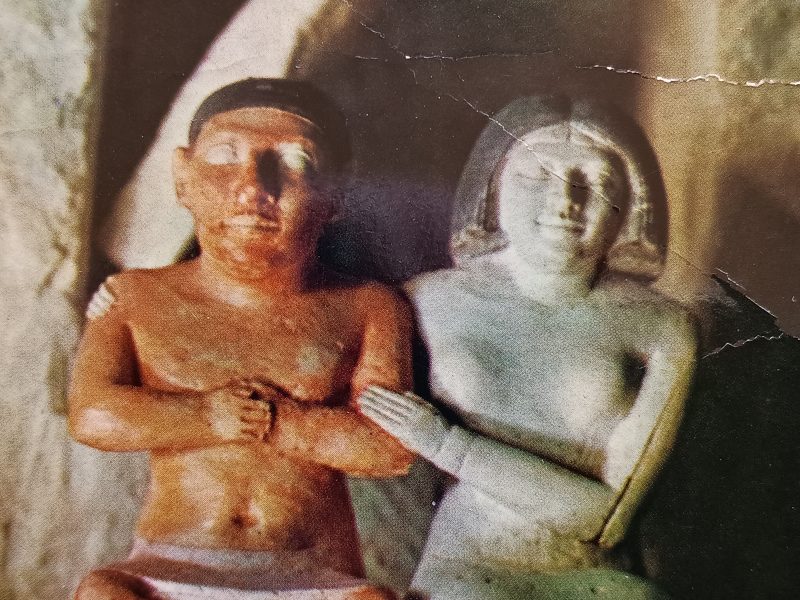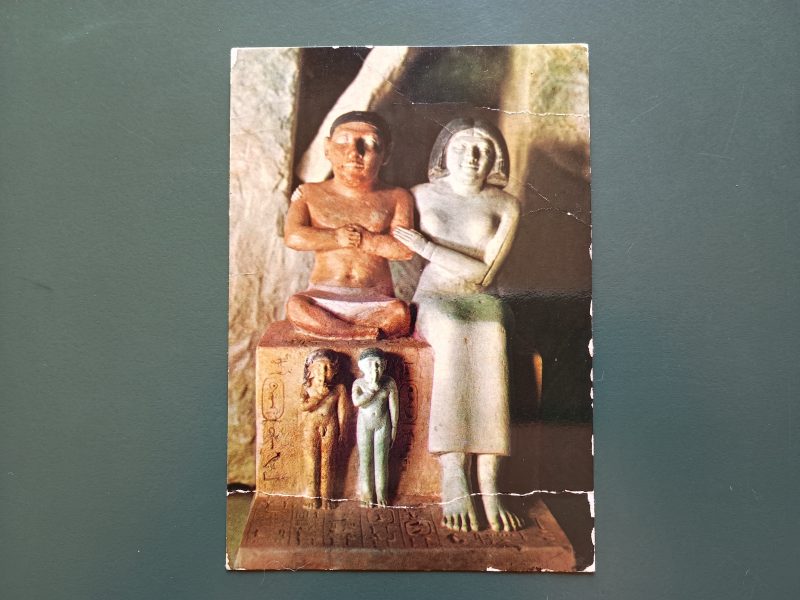 Non ricordo con precisione dove e quando l’ho trovata ma mi ha subito affascinato, l’ho tenuta appesa sulla parete dello studio per più di un anno e da qualche settimana è posata sul mio tavolo: è una vecchia cartolina del Museo Egizio de Il Cairo (un posto dove non sono mai stato), rappresenta una scultura con due figure in terracotta dipinta, dietro c’è scritto: Dwarf Sened, his whife Senetyotes and two children, 5th. Dyn., 2560 B.C. Queste due figurine sono rappresentate vicine, lui è seduto con le gambette incrociate (dwarf, in effetti, significa nano) e si tiene compiaciuto le mani sul petto, lei è seduta accanto a lui, le sue lunghe gambe sono fasciate da una semplice veste bianca. Senetyotes tiene una mano sulla spalla e una sul braccio di Seneb e lo abbraccia con delicatezza. I loro visi sono belli e splendenti, moglie e marito ci guardano dal profondo del tempo e sorridono, si amano e sono felici.
