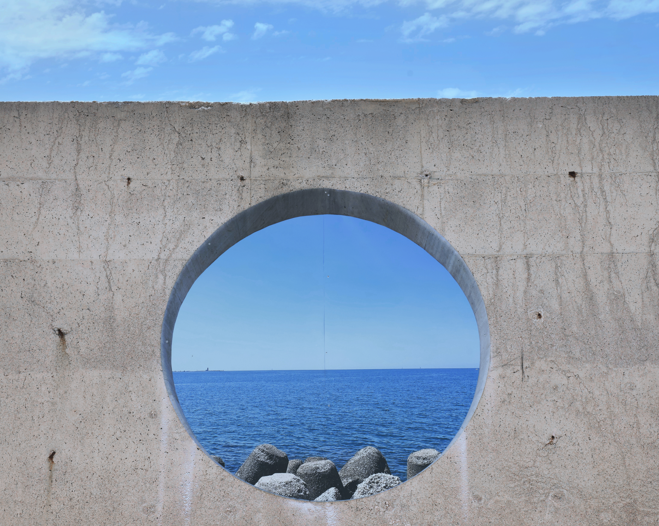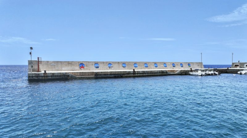 L’intervento interessa il frangiflutti del porto di Scauri, una struttura imponente in cemento armato. Qui Sbagliato ha inserito undici oblò che, come aperture verso l’orizzonte, modificano la percezione dello spazio. Il risultato è un’opera che alleggerisce visivamente la massa del frangiflutti e stimola una nuova relazione tra chi osserva e il paesaggio, invitando abitanti e visitatori a riscoprire un orizzonte familiare con uno sguardo rinnovato.