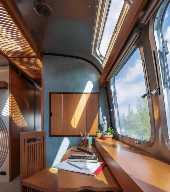 La luce naturale è protagonista assoluta. Con 29 finestre –il numero più alto mai montato su un Airstream – il trailer richiama la poetica di Wright nel dissolvere i confini tra interno ed esterno. Ci sono ampie vetrate avvolgenti, oblò circolari, un lucernario ispirato a Taliesin West e un portellone posteriore che si apre direttamente sul paesaggio circostante.