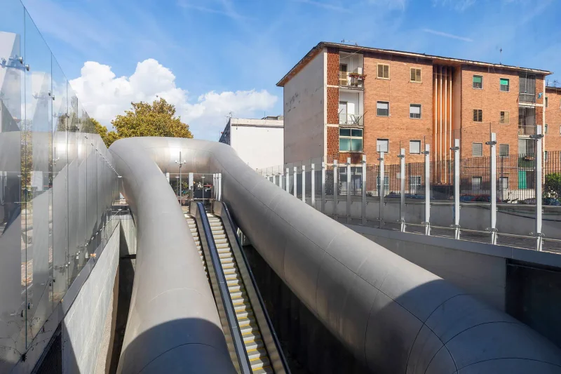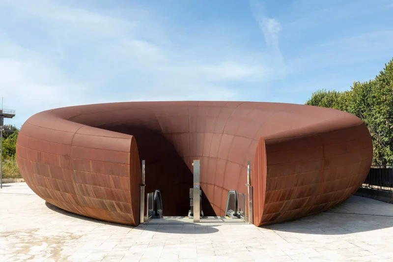 L’ingresso principale emerge dal terreno come una massa geologica viva. Realizzato in acciaio corten, il suo profilo affusolato cambia lentamente colore con l’ossidazione, evocando varchi sotterranei e richiamando suggestioni mitiche e dantesche. Sul lato Traiano, un volume tubolare, liscio e regolare, si apre come un anello metallico, leggibile e geometrico, in netto contrasto con la monumentalità dell’altro accesso.