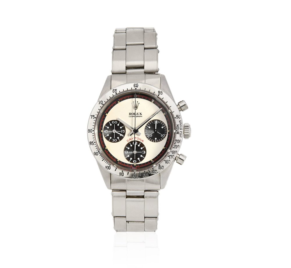 Ancora più ambito è il Cosmograph Daytona ref. 6239 del 1965, celebre per il suo quadrante “Paul Newman” a tre colori, qui ristampato, e la configurazione con pulsanti tondi e bracciale Oyster. Un’icona assoluta dell’orologeria sportiva, sempre più rara sul mercato, con una base d’asta di 20 mila euro.